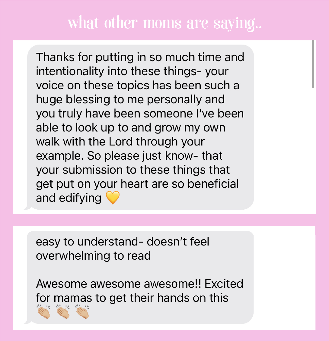 This guide is visually pleasing, easy to read, and jam packed full of biblical encouragement and reminders, as well as really practical examples of ways to lower the amount of over stimulation and overwhelm in your home, heart, and family. Highly recommend, whether you’re a brand new or more seasoned mom, I’m sure it will be a blessing to you.